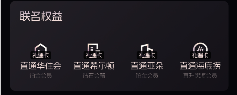 除表除此,另有联名权柄含金量高的,钻石、亚朵铂金、海底捞黑海能够直通华住会铂金、希尔顿,顶级会员啊个顶个都是。