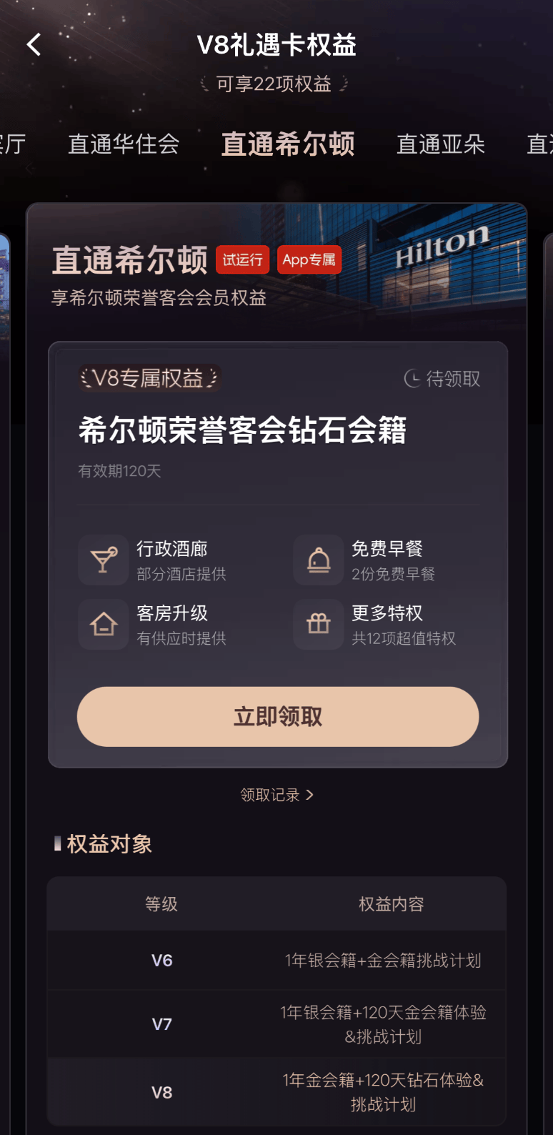 升级到了希尔顿钻石会员我用滴滴 V8 一步,V8 失效后比及滴滴 ,联己方的滴滴会员再用希尔顿钻石闭, 次滴滴 V7就能领取 8,滴滴 V7 了吧差不多能终年稳持? 除表除此,室每月 1 次另有机场停滞,应商的非餐饮版查看了是龙腾供,亚洲万博手机版宾厅运用仅接济贵;每月 1 次高铁高朋厅,是悦途对应的。有去实测运用这些木木没,限制仍是相当广的但查看高朋厅接济。